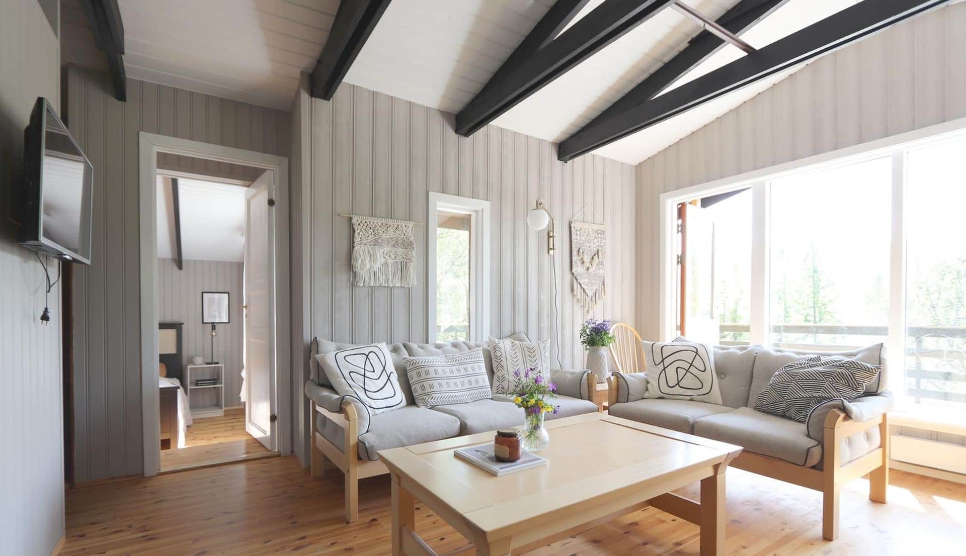 Logaland is a cozy wooden cabin nestled in the stunning Skorradalur valley, surrounded by peaceful forests and mountains. The cabin features two comfortable bedrooms, a fully equipped kitchen, a modern bathroom, and a bright living area with large windows overlooking nature.